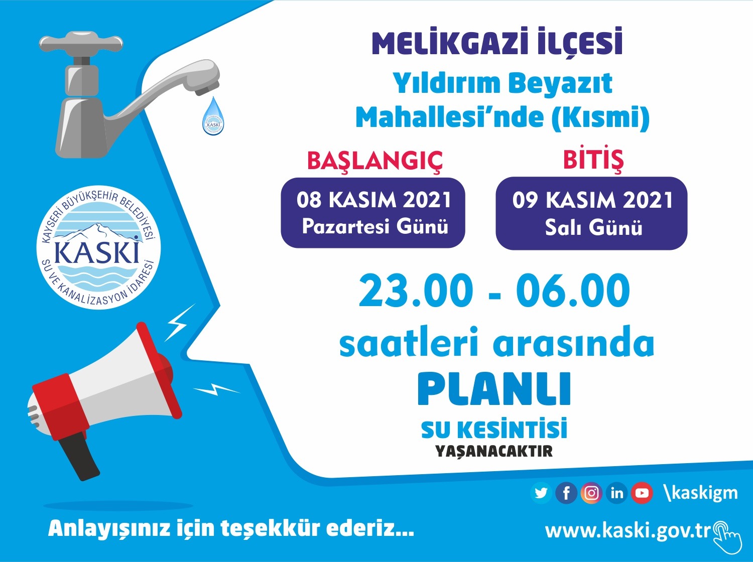 MELİKGAZİ İLÇESİ –Yıldırım Beyazıt (Kısmen) Mahallesinde içme suyu bağlantı çalışması nedeniyle 08.11.2021 tarihi 23.00 ile 09.11.2021 tarihi 06.00 saatleri arasında Planlı Su Kesintisi yaşanacaktır. Anlayışınız için teşekkür ederiz…