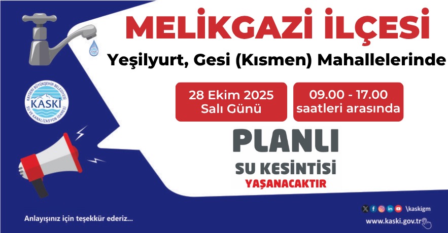 MELİKGAZİ İLÇESİ - Yeşilyurt, Gesi (Kısmen) Mahallelerinde içme suyu şebeke bağlantısı nedeniyle 28.10.2025 tarihinde 09.00 ile 17.00 saatleri arasında planlı su kesintisi yaşanacaktır. Anlayışınız için teşekkür ederiz.