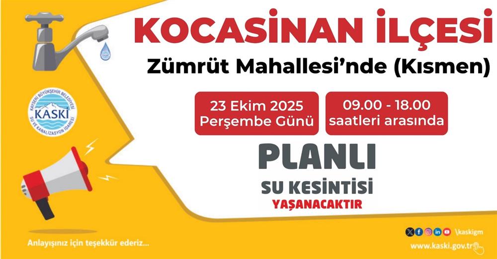 KOCASİNAN İLÇESİ - Zümrüt (Kısmen) Mahallesi'nde içme suyu bağlantı çalışması nedeniyle 23.10.2025 tarihinde 09.00 ile 18.00 saatleri arasında planlı su kesintisi yaşanacaktır. Anlayışınız için teşekkür ederiz.