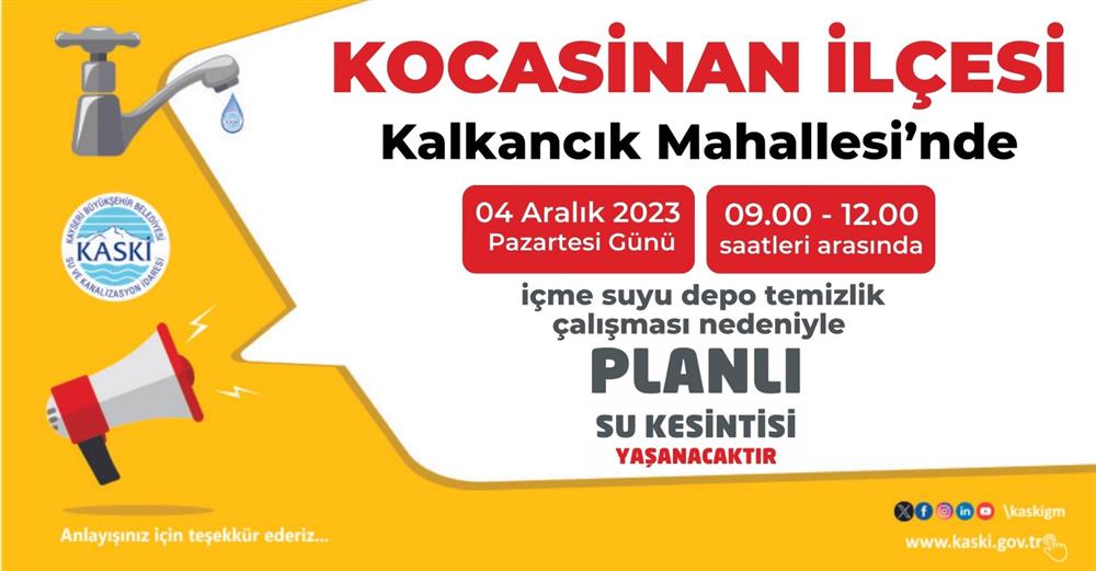 KOCASİNAN İLÇESİ – Kalkancık Mahallesi'nde içme suyu depo temizlik çalışması nedeniyle 04.12.2023 tarihinde 09.00 ile 12.00 saatleri arasında Planlı Su Kesintisi yaşanacaktır. Anlayışınız için teşekkür ederiz.