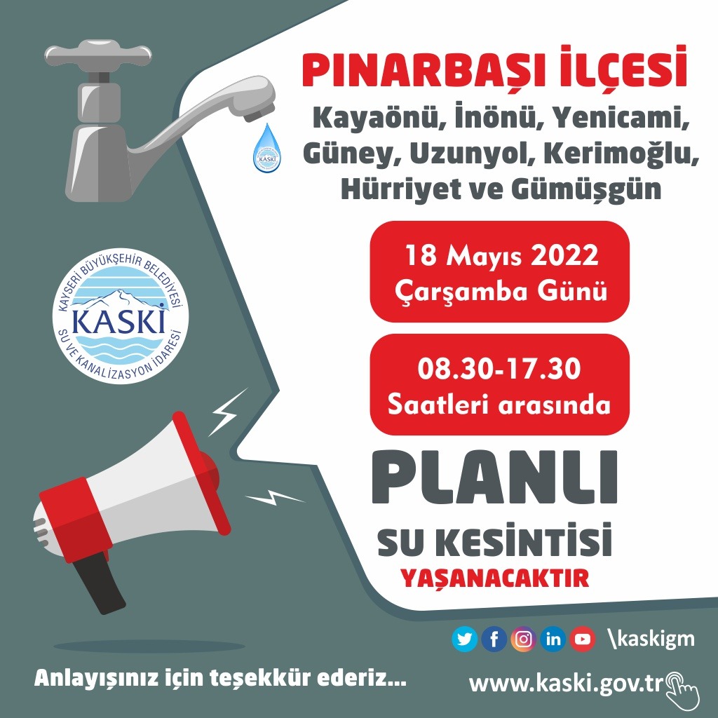 yapılacak olan bakım onarım çalışması nedeniyle 18.05.2022 tarihinde, 08.30 ile 17.30 saatleri arasında Planlı Su Kesintisi yaşanacaktır. Anlayışınız için teşekkür ederiz.