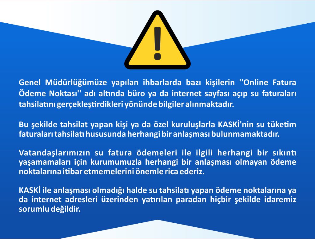 KASKİ ile anlaşması olmadığı halde su tahsilatı yapan ödeme noktalarına ya da internet adresleri üzerinden yatırılan paradan hiçbir şekilde idaremiz sorumlu değildir.